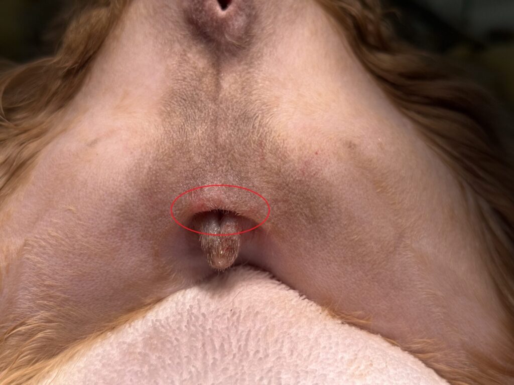 会陰部の皮膚(赤丸)が陰門部を覆ってしまい、皺になったところが皮膚炎を起こしていました。今後も繰り返す可能性があったため、避妊手術の際に会陰形成術も同時に行うこととしました。